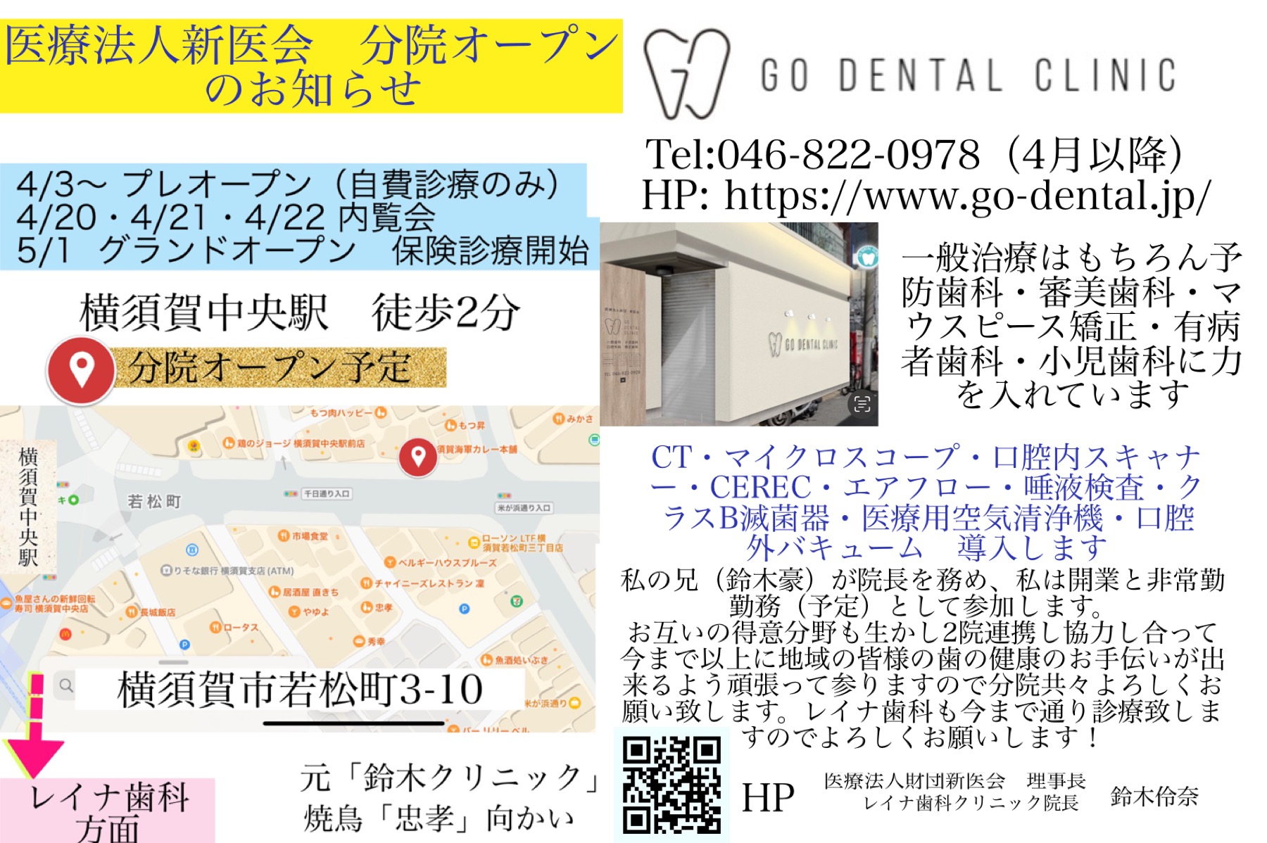 4月に医療法人新医会分院として私の兄が院長を務める「Go Dental Clinic」が横須賀市若松町にてオープン予定です。